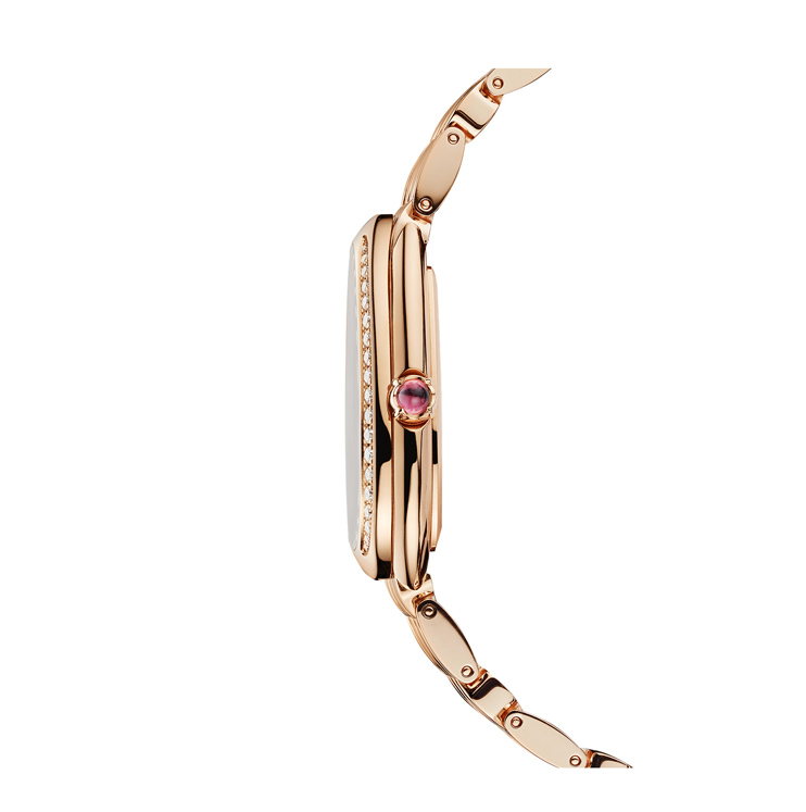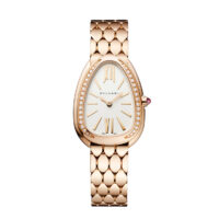 Serpenti Seduttori watch with 33 mm 18kt rose gold case set with round brilliant cut diamonds and 18 kt rose gold crown with a cabochon-cut pink rubellite. White silver opaline dial. 18 kt rose gold bracelet with folding clasp. Quartz movement