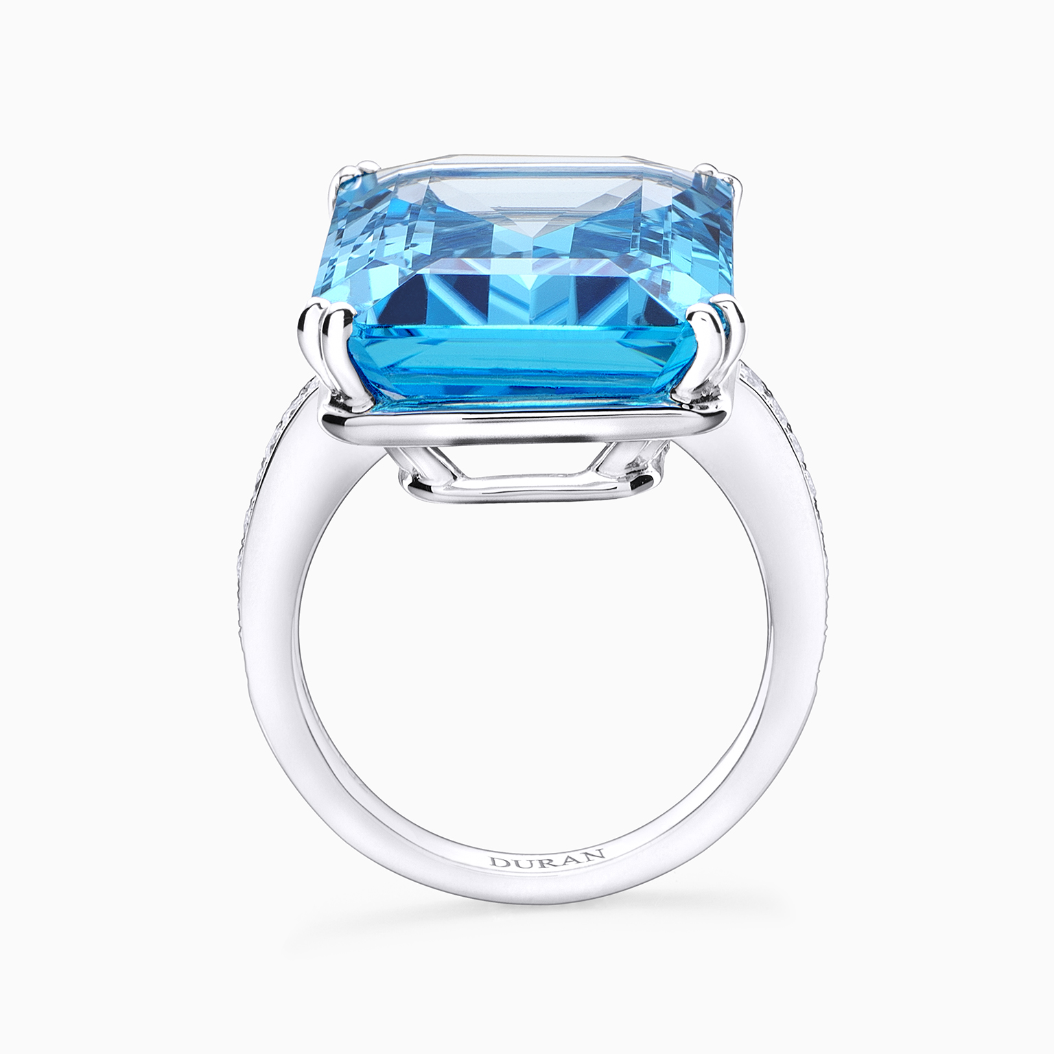Durán Ring Big Stones Collection in 18 kt white gold and diamonds with big blue topaz emerald cut of 26.50 cts
