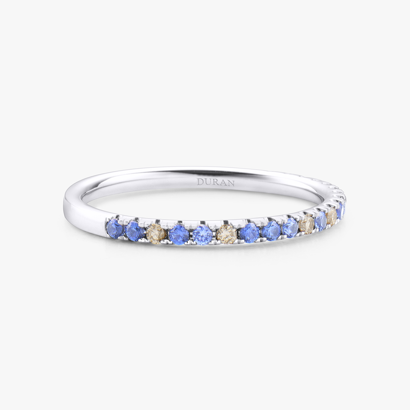 Durán Ring Arcoiris Collection in white gold, line of brown diamonds and blue sapphires set in claws
