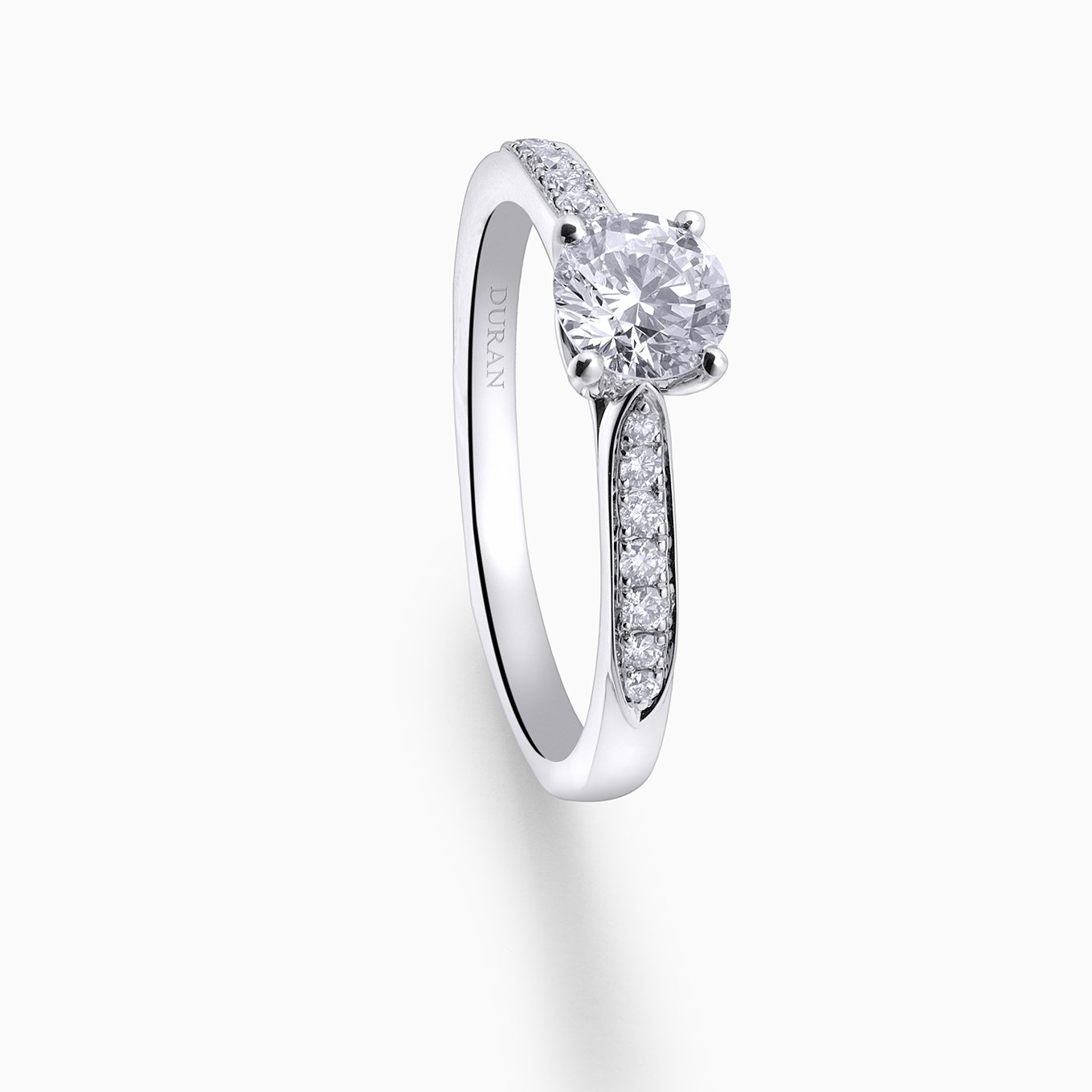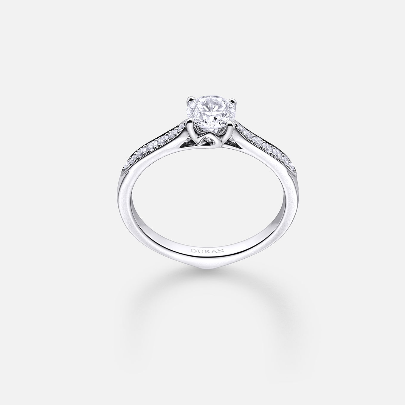 Durán Engagement Ring Solitarios Collection, Tulipán model, in white gold with a central brilliant of 0.50 cts set in 4 claws and brilliant cut diamonds on both sides
