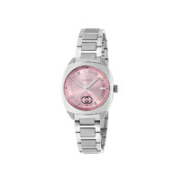 29 mm stainless steel case, pink dial with 8 diamonds, stainless steel bracelet, Gucci Interlocking small seconds display, quartz movement