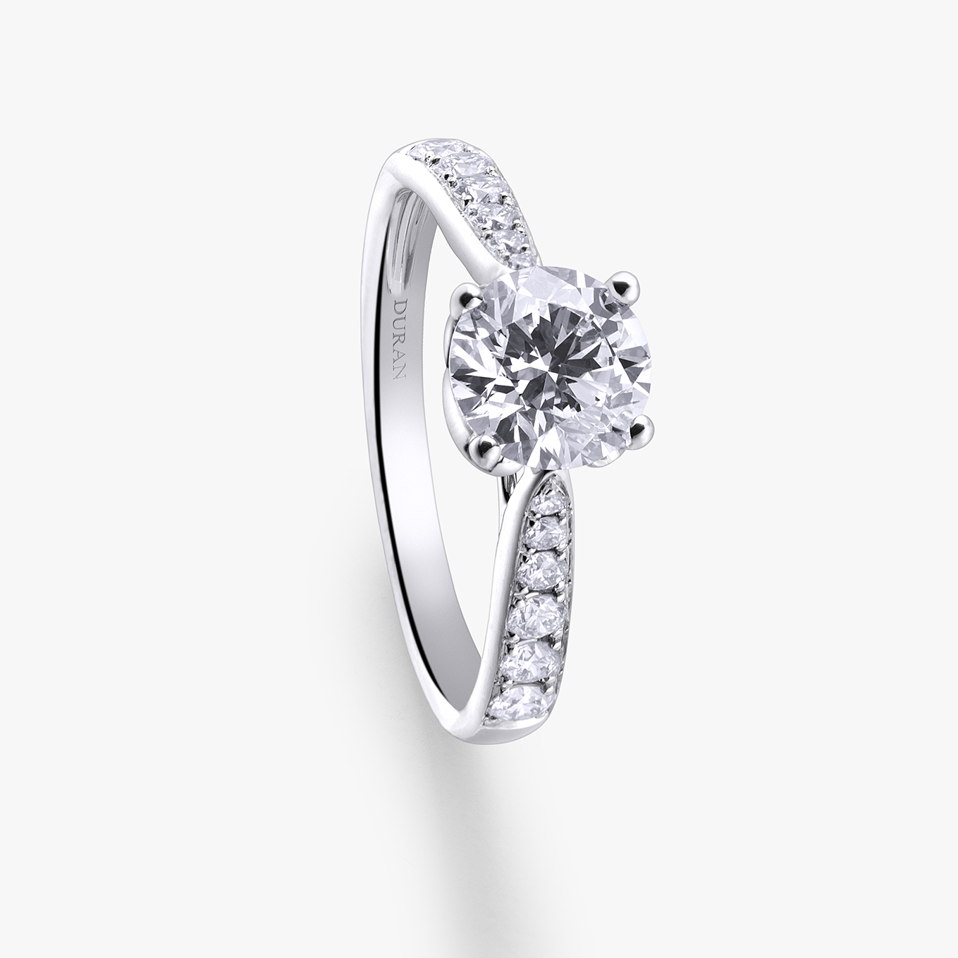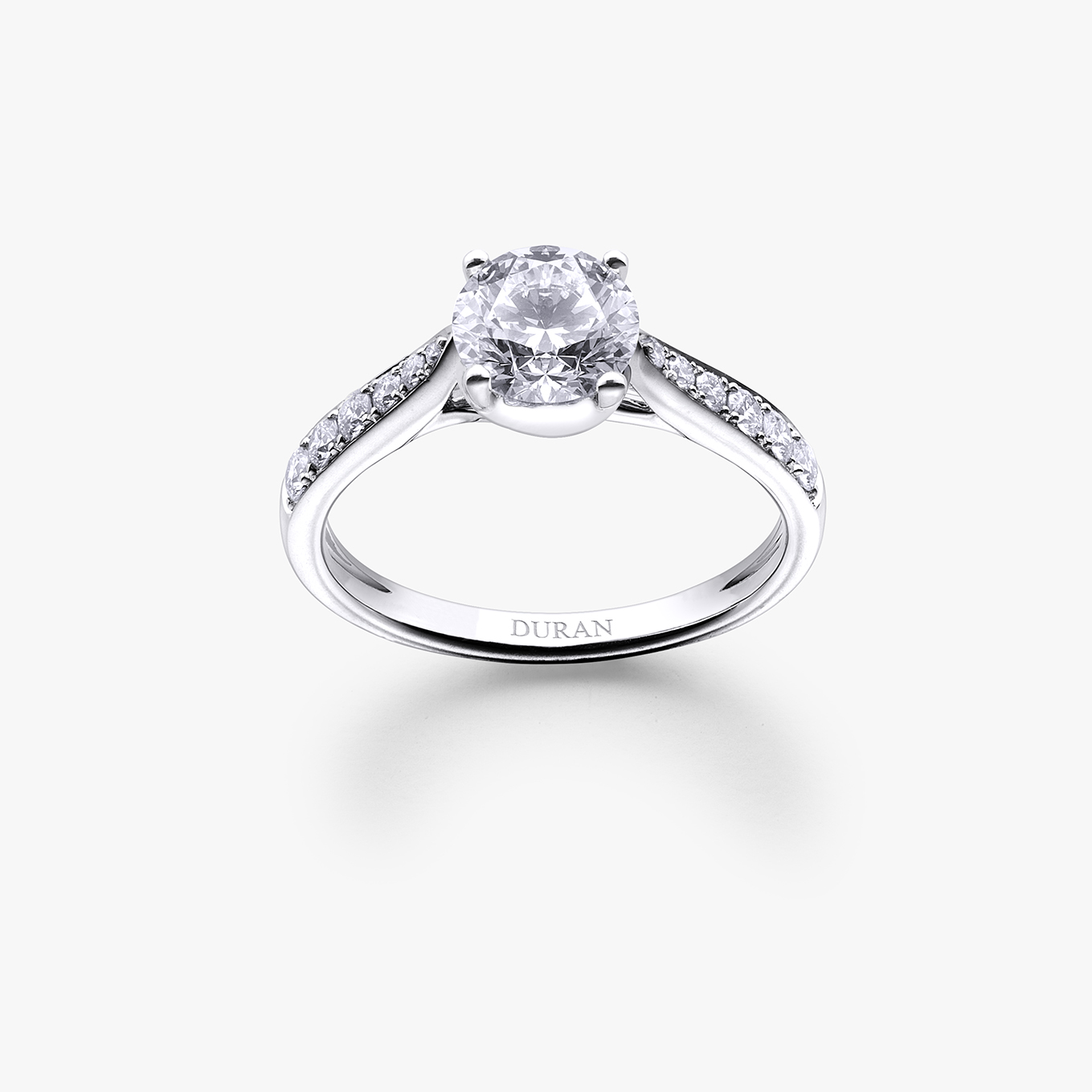 Anillo de Compromiso Durán de la Colección Solitarios, modelo Nenufar, en oro blanco con brillante central 1cts engastado en 4 garras y diamantes talla brillantes a ambos lados