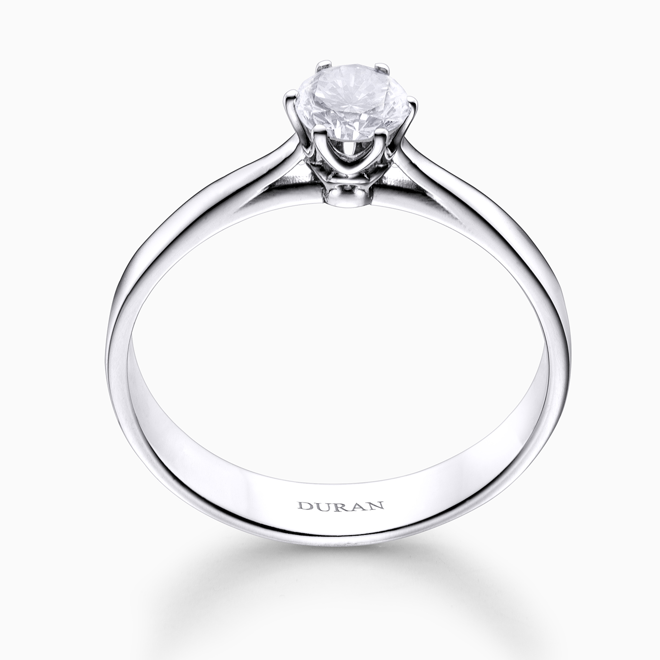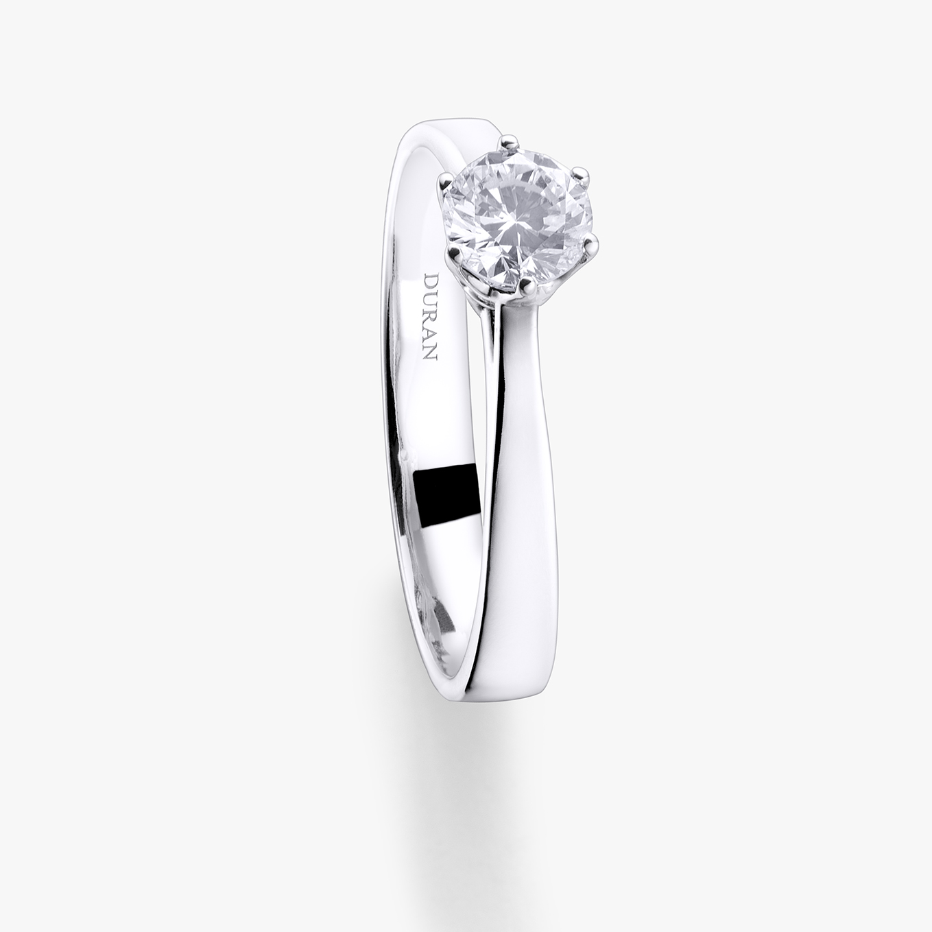 Anillo de Compromiso Durán de la Colección Solitarios, en oro blanco y diamante talla brillante central engastado en 6 garras en forma de corona