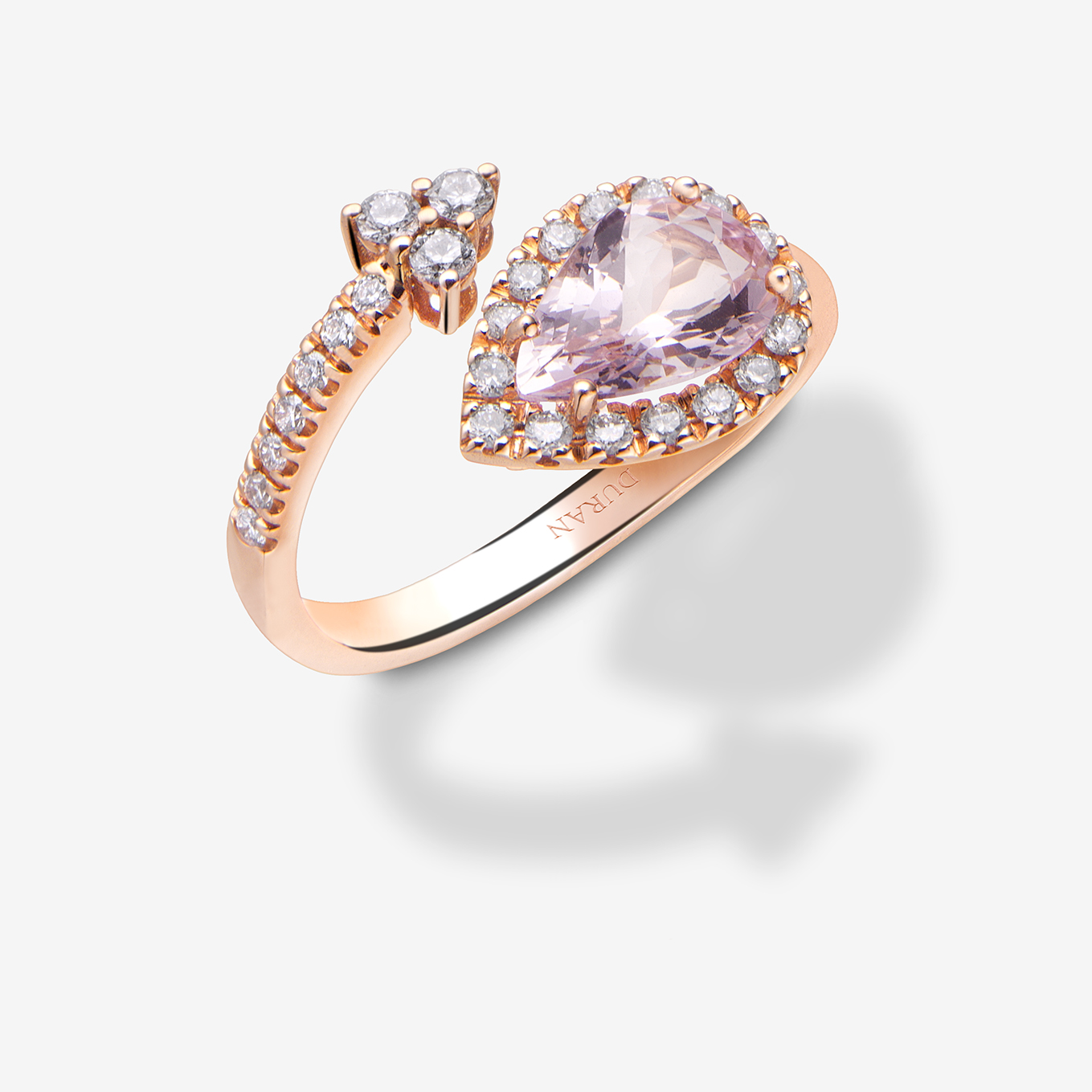 Anillo Durán de la Colección Como en oro rosa y morganita talla pera con orla y punta de diamantes en talla brillante 0,35ct