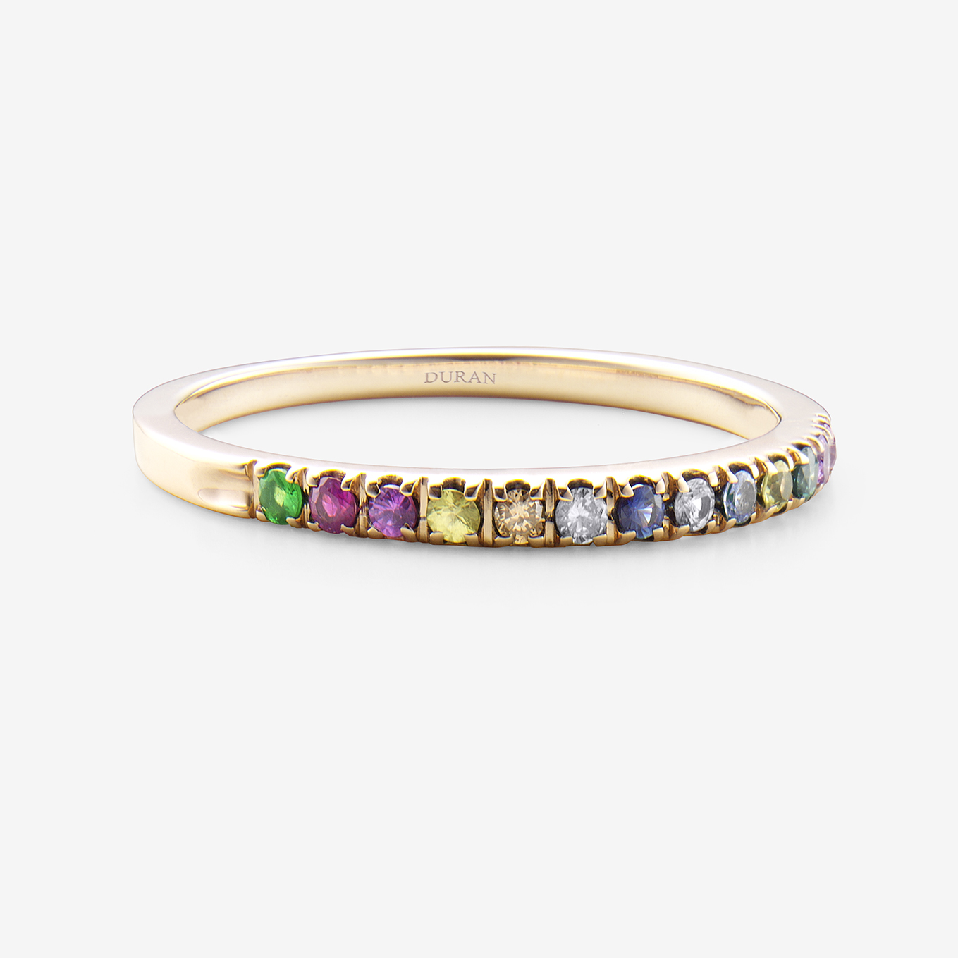 Anillo Durán de la Colección Arcoiris en oro rosa y línea de brillantes, zafiros y piedras de color engastados en garras