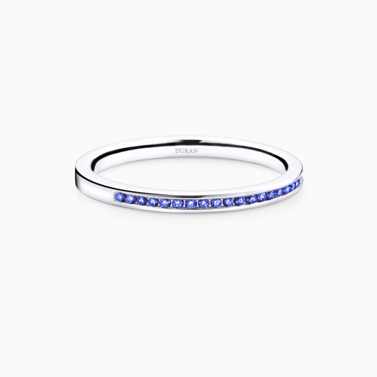 Anillo Durán de la Colección Arcoiris de oro blanco y línea de zafiros azules engastados en carril