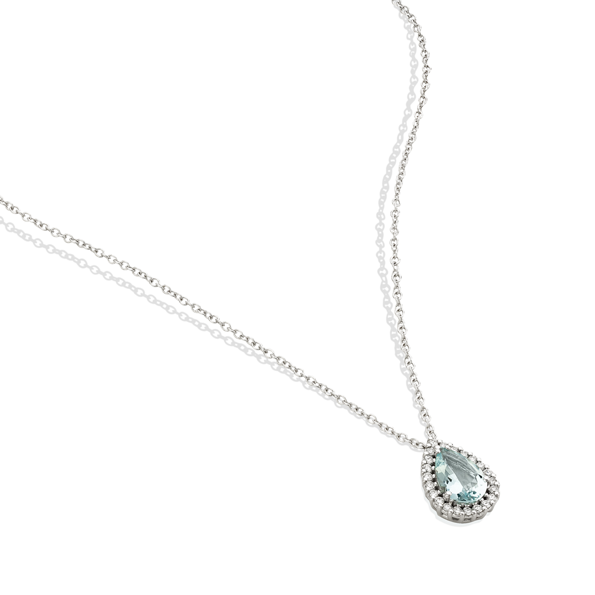 Colgante Durán de la Colección Como en oro blanco y aguamarina talla pera con orla de diamantes en talla brillante 0,20ct