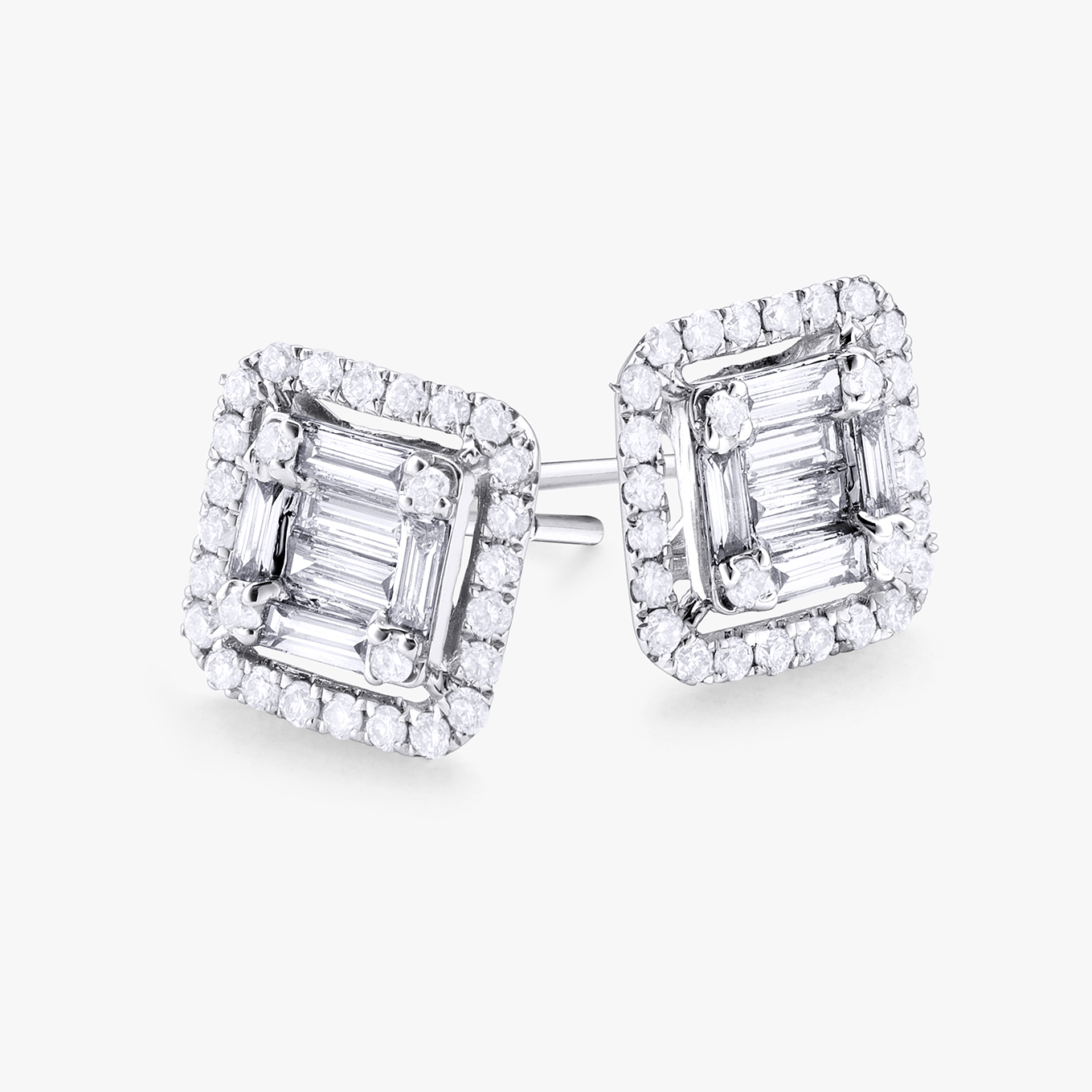 Pendientes Durán de la colección Shine, en oro blanco y diamantes talla baguete 0,75 cts con orla de diamantes talla brillante brillante