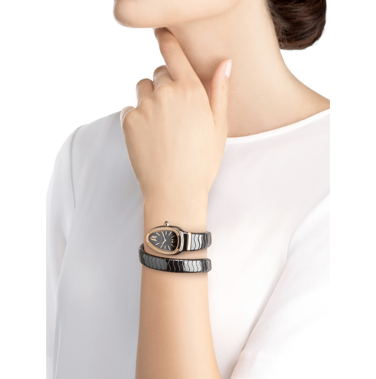 Reloj Serpenti Spiga 35 mm de una vuelta con caja de cerámica negra, bisel en oro rosa de 18 qt con diamantes talla brillante engastados, esfera lacada en negro y brazalete de cerámica negra con elementos en oro rosa de 18 qt