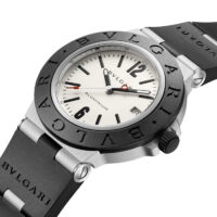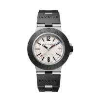 Reloj Bvlgari Aluminium con movimiento mecánico de manufactura de carga automática, caja en aluminio y titanio de 40 mm, bisel en caucho negro con grabado BVLGARI BVLGARI, esfera gris y correa en caucho negro. Hermético hasta 100 metros.