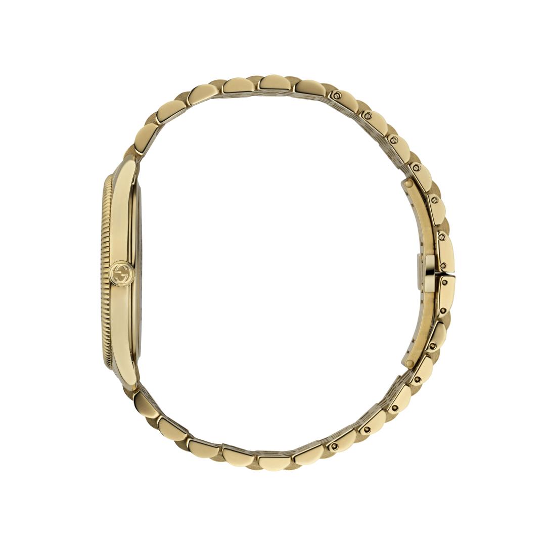 Caja de PVD oro amarillo, esfera plateada satinada con abeja como segundero y armis de nueve eslabones de PVD oro amarillo