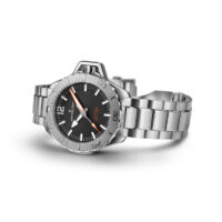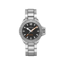 El Khaki Navy Frogman Automatic destaca por su rendimiento técnico y su diseño distintivo. Su caja de acero inoxidable de 41 mm cuenta con una corona atornillada protegida por un robusto protector en forma de puente que garantiza una resistencia al agua.